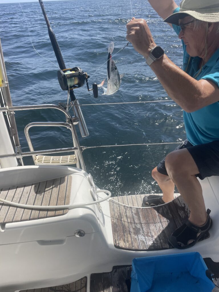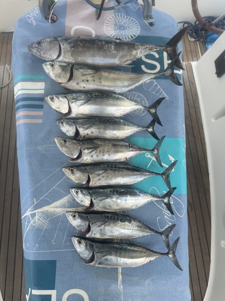 Unterwegs haben wir ein ungewöhnliches Glück beim Angeln gehabt. Stefan hat kurz hintereinander 9 kleine Thunfische aus dem Wasser geholt und war kaum zu bremsen noch weiter zu angeln. Barbara musste ihm die „Angellizenz“ vorübergehend entziehen. Unsere Tiefkühlkapazitäten sind sehr begrenzt und wir waren nicht in der Lage bis zu unserer Rückreise nach Deutschland alles aufzuessen. Einen Teil von unserem Fang haben wir filetiert und eingeschweißt und den größeren Teil an dankbare Nachbarsboote verschenkt.